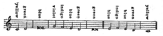 An alternate play of various colored light would bear a very striking analogy to a simple melody. We might even transpose Gregorian Plain-Song from tone into color by the simple process of putting it "up" forty-one octaves. Take, for instance, the ancient Tonus Regius, and, writing it in the key of C (instead of F) in order that its highest notes shall not overstep the narrow bounds of the color scale, we would obtain the following: