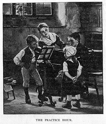 I wish that all who read this article would try at the next practice hour to get just as much pleasure as possible out of their playing. Treat it just exactly as you would a game. Look at the little picture upon this page called the "Practice Hour." See the eager faces of the little folks and how earnestly they are striving to get enjoyable musical effects out of their crude musical instruments. You may learn a great lesson from the children of Germany, many of whom have grown from peasant homes like the one pictured to become great masters. Beethoven, Haydn, Mozart and Bach came from homes of this kind. Without one-tenth of the advantages that most of the readers of this page possess they achieved immortal fame.
